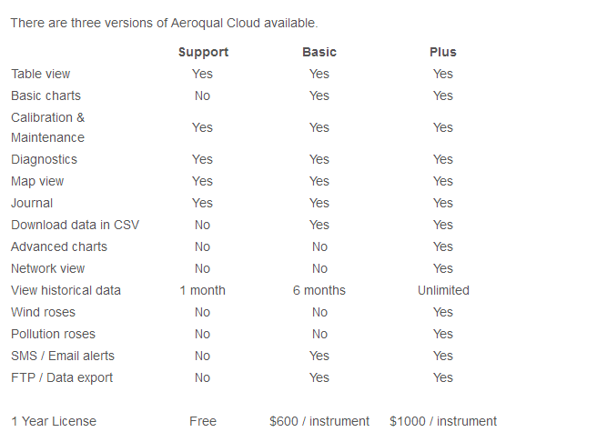 There are three versions of Aeroqual Cloud available (see What’s Included). Aeroqual Support is included free of charge; Aeroqual Basic and Aeroqual Plus include extra features that are paid for on a yearly basis.